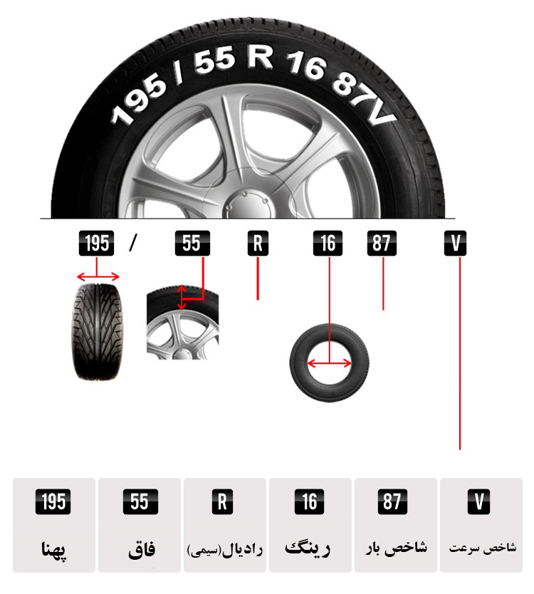 55 : فاق لاستیک برحسب درصد می باشد که با ضرب پهنای لاستیک در فاق عرض فاق برحسب میلی متر بدست می آید برای مثال 195x0/55=107.25 با توجه به این فرمول فاق این لاستیک 107.25 میلی متر است
